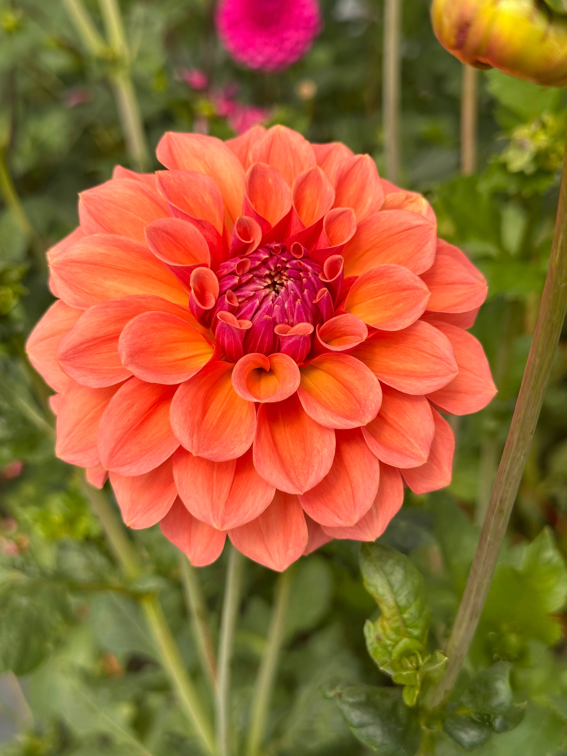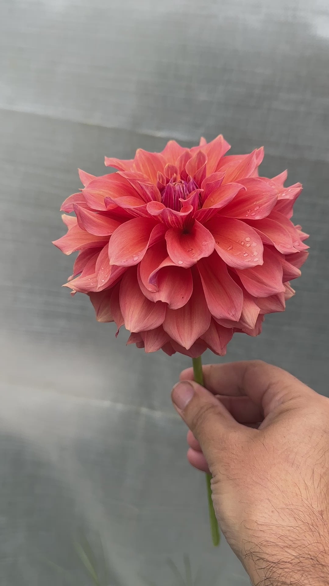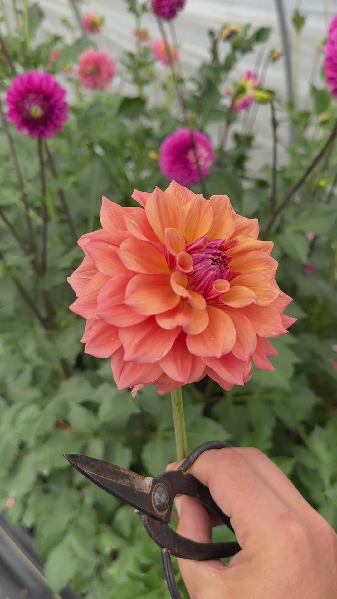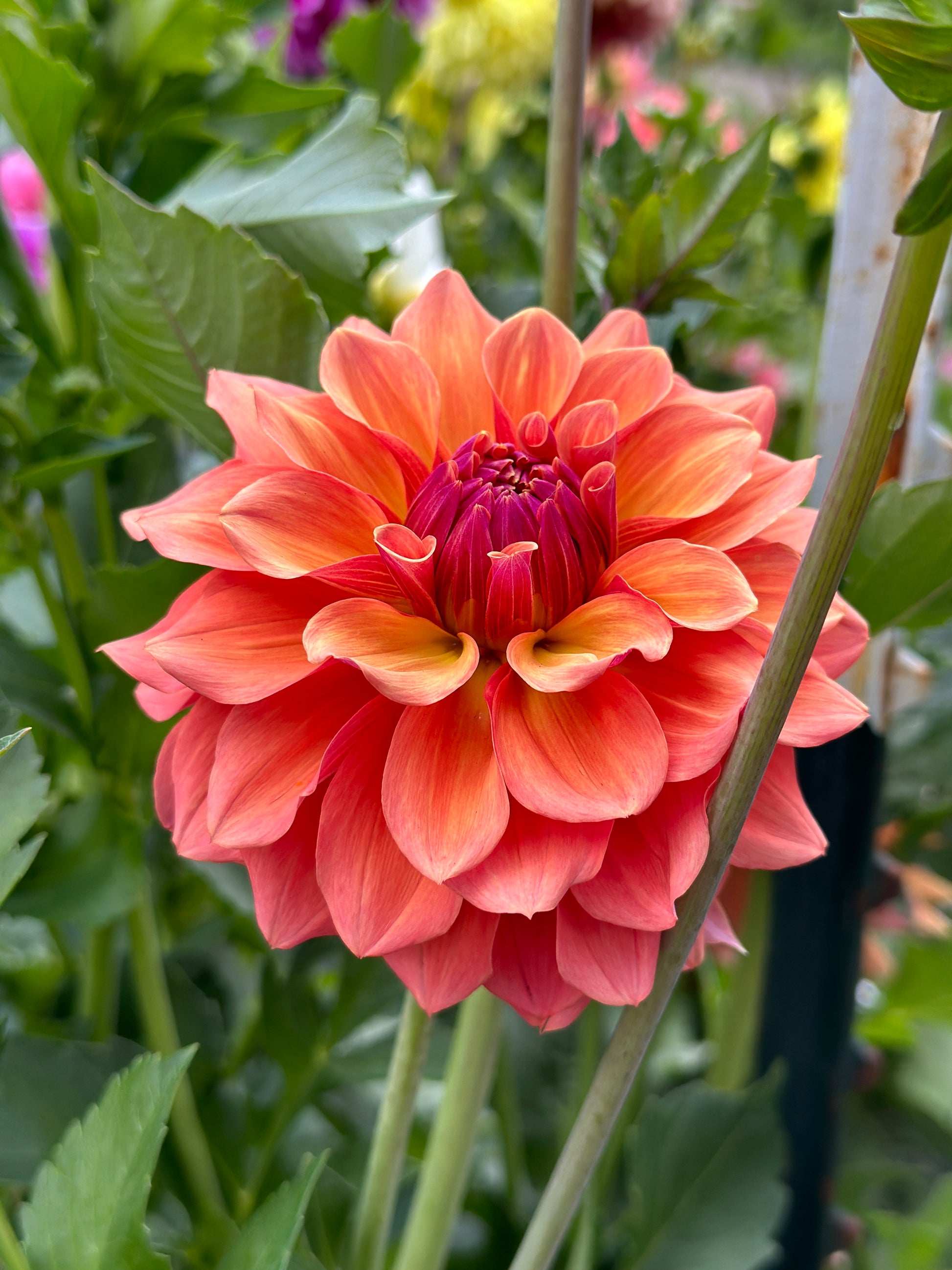 Formal Decorative. Medium-sized blooms, averaging 4-5”, in vivid coral-orange with a magenta center. Flowers face three-quarter to fully upward, making them easy to cut and excellent for arranging. Plants grow to about 4-5’ with a sturdy, branching habit and reliable stem strength. A steady producer with good vase life that carries its flowers well above the foliage.