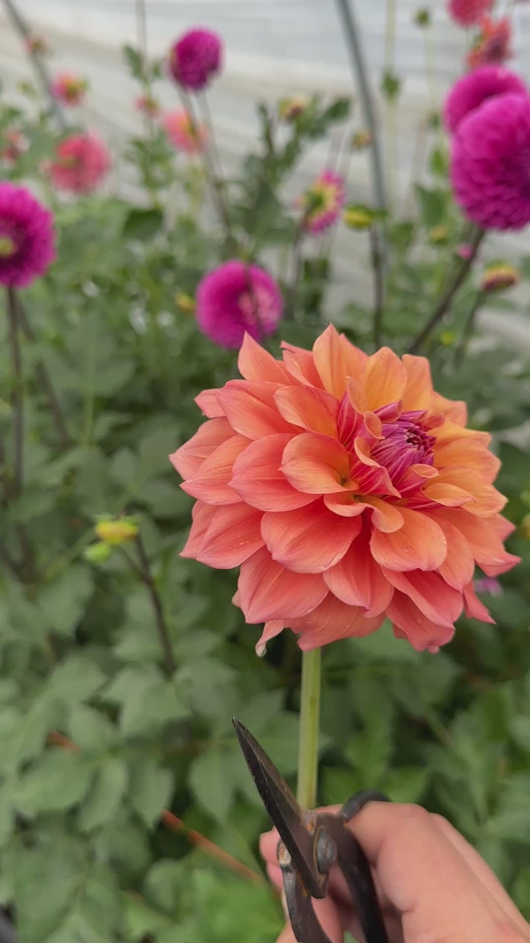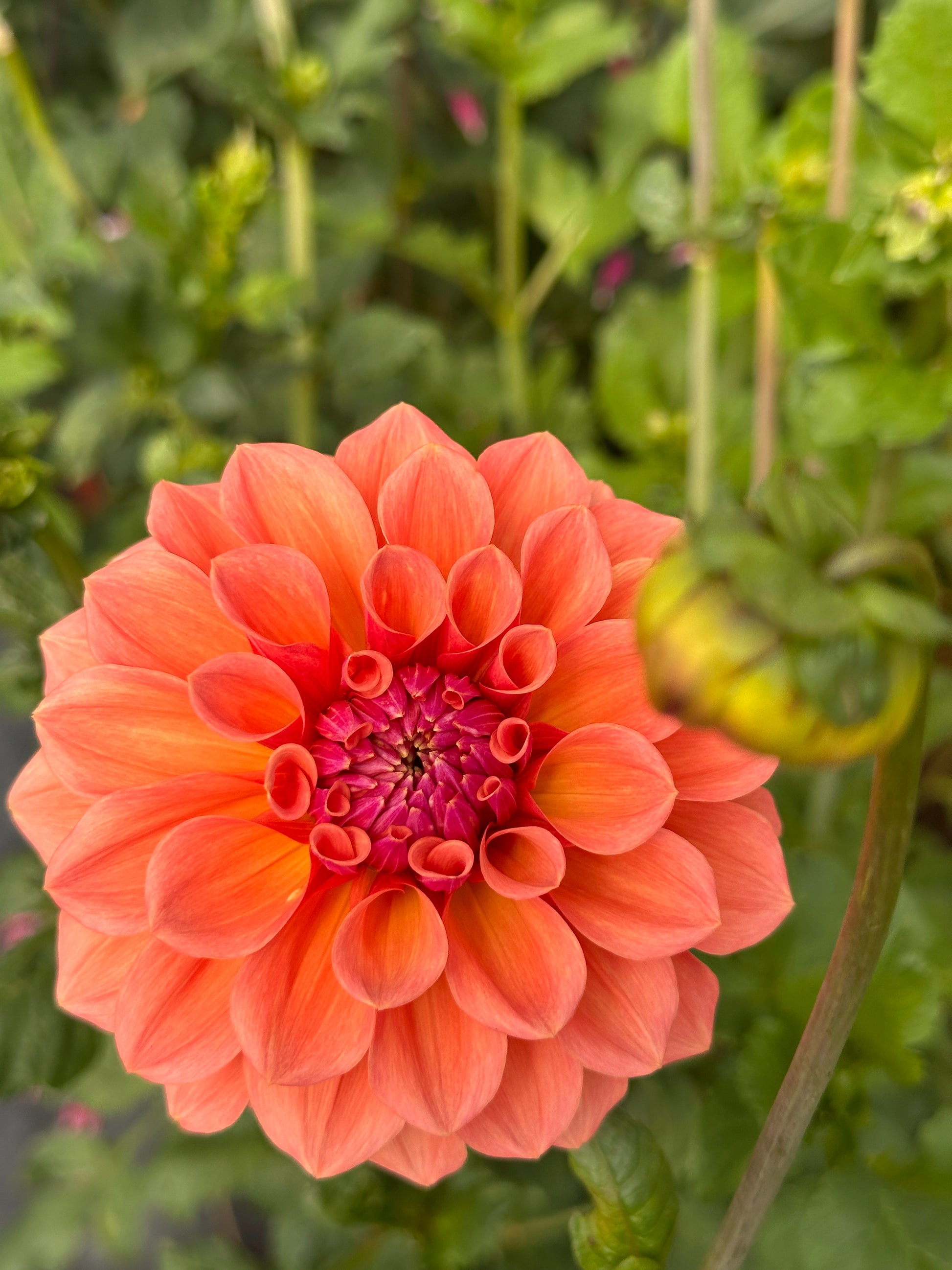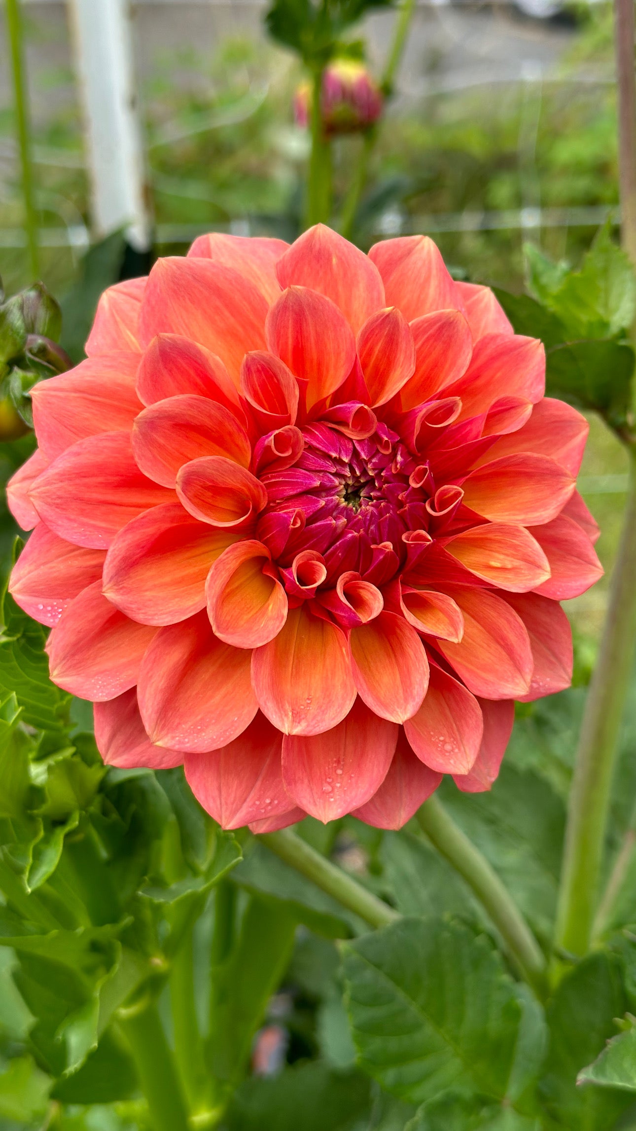 Formal Decorative. Medium-sized blooms, averaging 4-5”, in vivid coral-orange with a magenta center. Flowers face three-quarter to fully upward, making them easy to cut and excellent for arranging. Plants grow to about 4-5’ with a sturdy, branching habit and reliable stem strength. A steady producer with good vase life that carries its flowers well above the foliage.