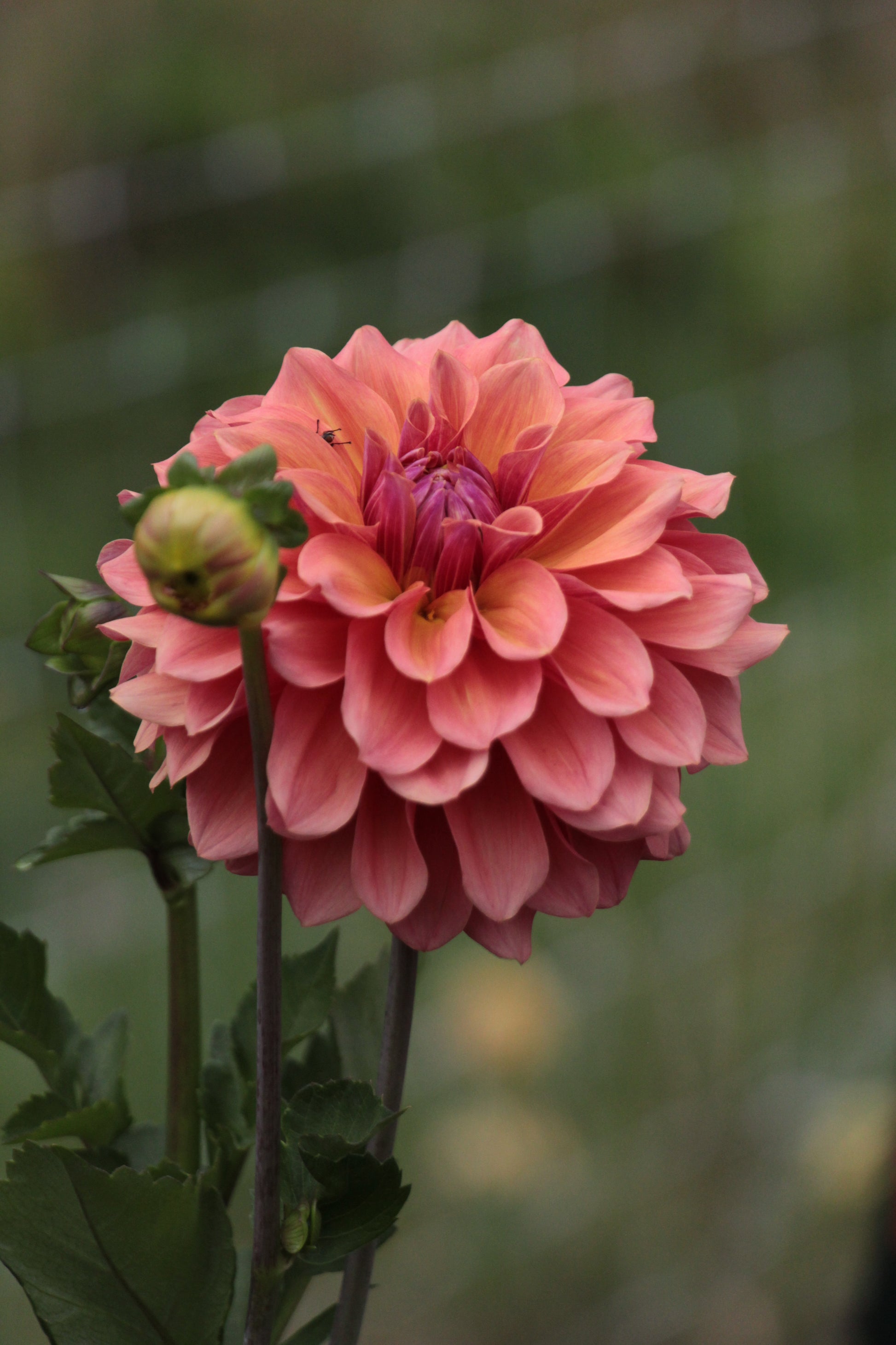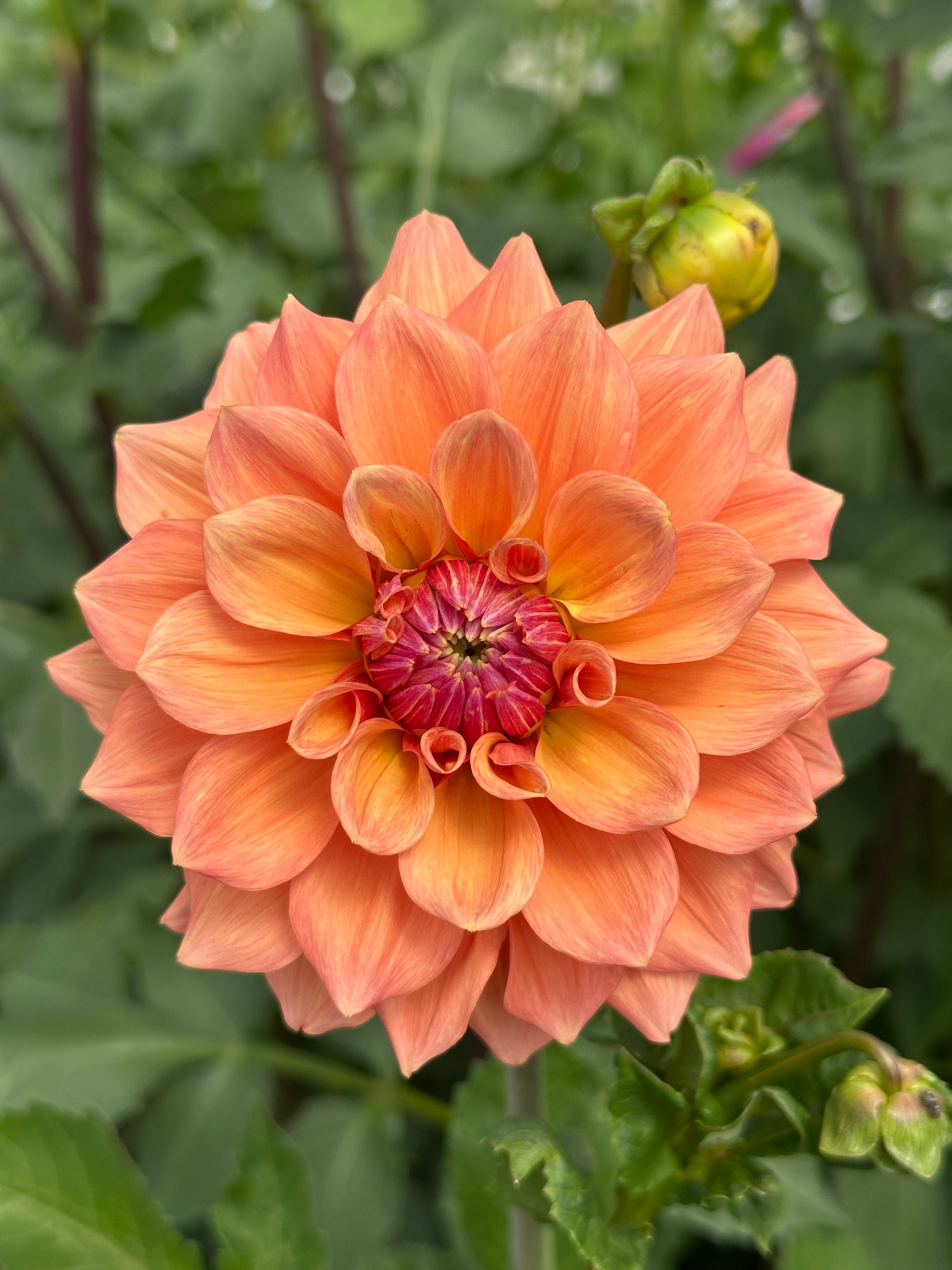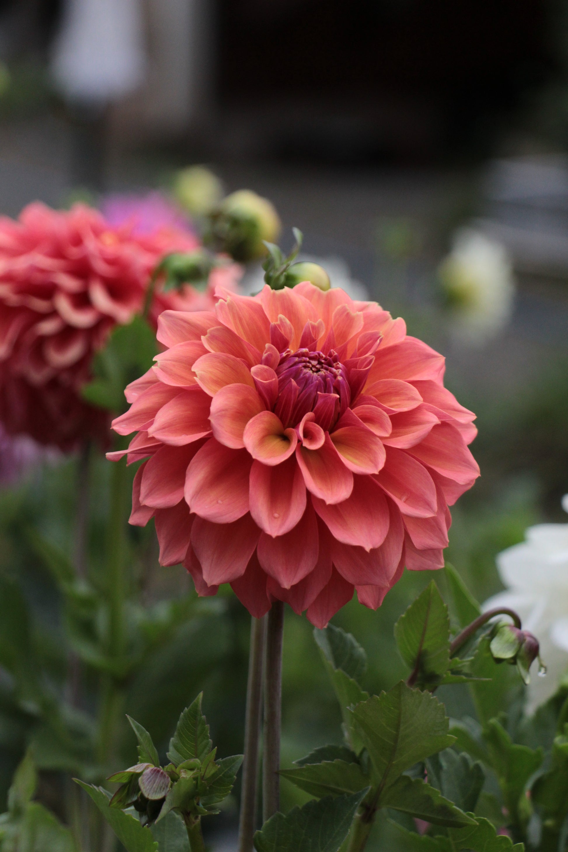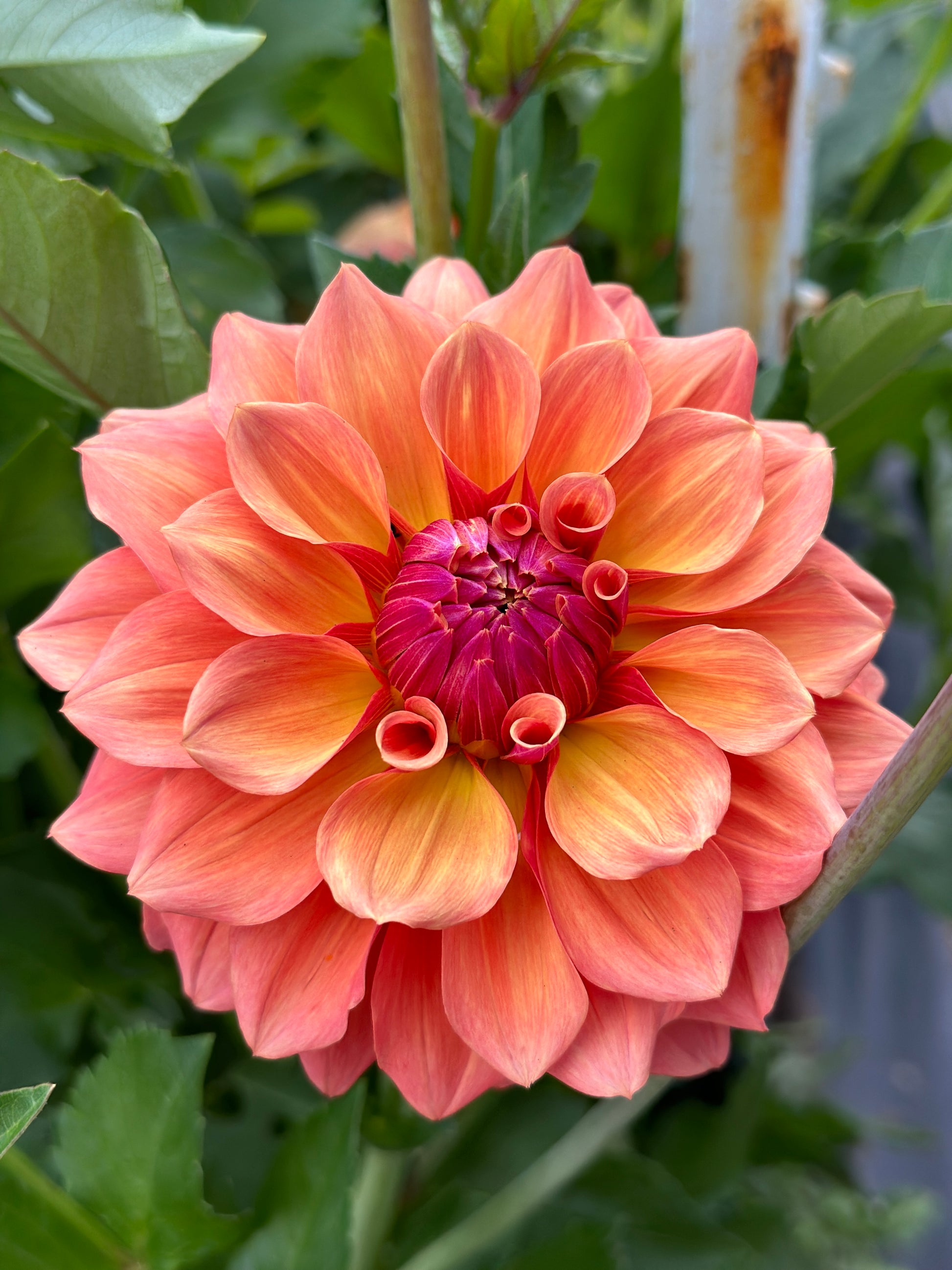 Formal Decorative. Medium-sized blooms, averaging 4-5”, in vivid coral-orange with a magenta center. Flowers face three-quarter to fully upward, making them easy to cut and excellent for arranging. Plants grow to about 4-5’ with a sturdy, branching habit and reliable stem strength. A steady producer with good vase life that carries its flowers well above the foliage.