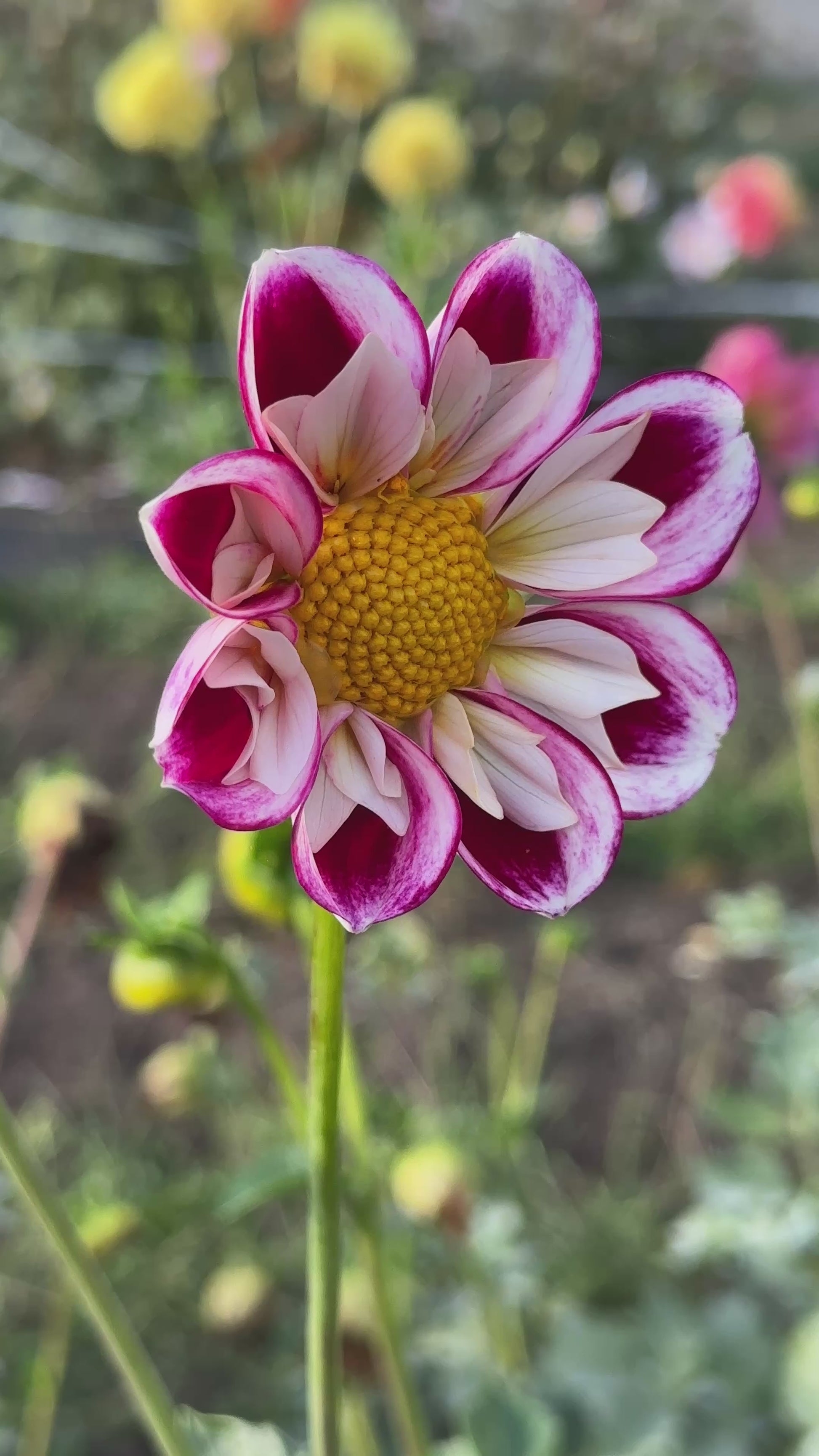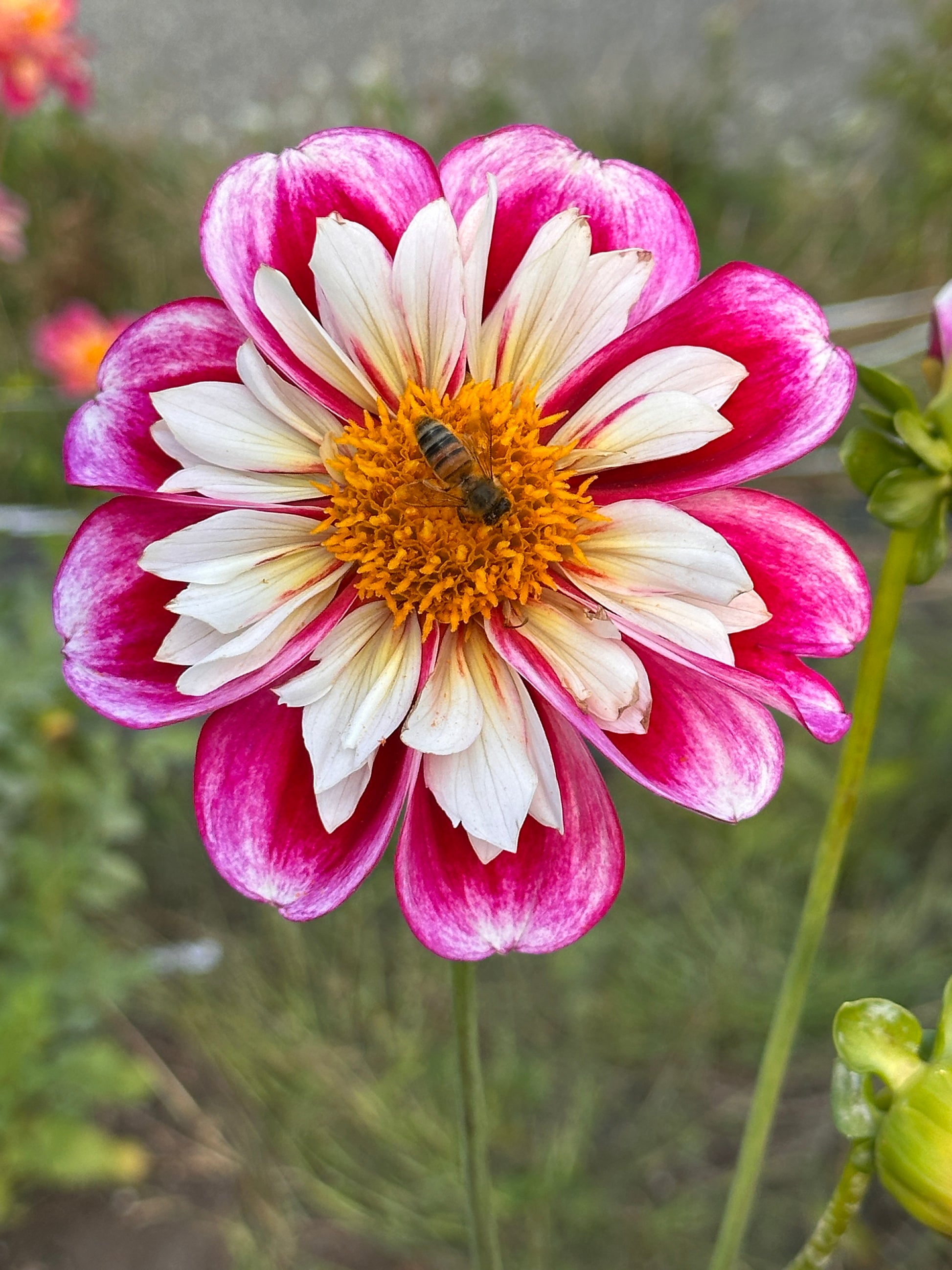 Bumble Rumble stands tall with bright, high-contrast blooms that always catch attention. The petals blend vivid pink edges with creamy white centers around a golden heart that draws pollinators from across the garden. Bees absolutely love this one.