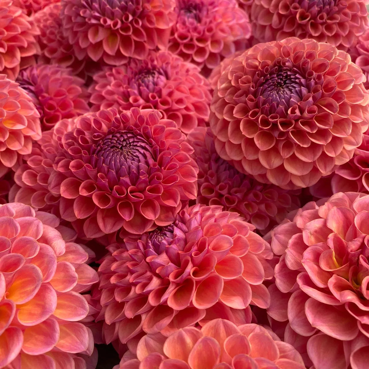 One of the first dahlias I ever grew and still a staple in the field. Jowey Winnie produces tight, fully double ball-shaped blooms about four inches across, with layers of petals that curve inward in that classic, perfect ball form. The color is hard to describe exactly, somewhere between soft pink, dusty rose, and peach with mauve undertones that shift in the light.